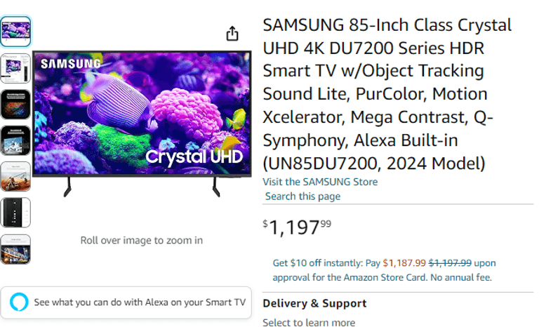 SAMSUNG 85-Inch Crystal UHD 4K DU7200 Series Smart TV , Employee Tested
