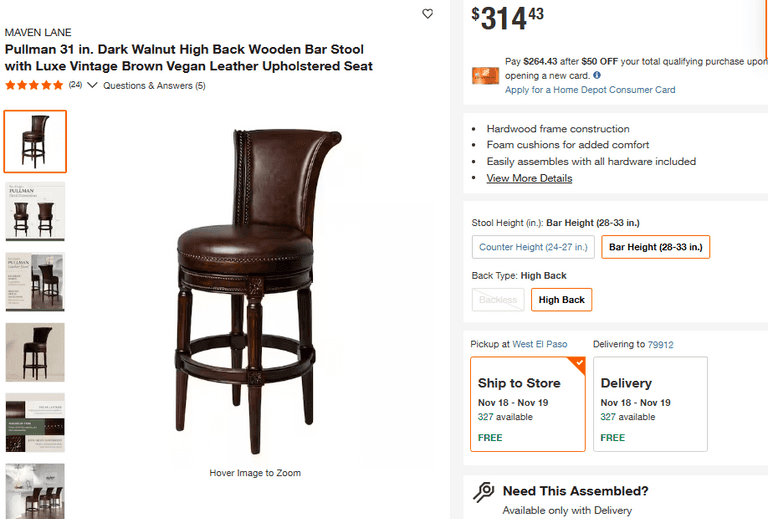 MAVEN LANE Pullman 31 in. Dark Walnut High Back Wooden Bar Stool | Damaged | (See Condition Notes)
