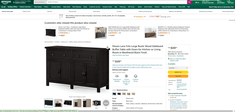 Maven Lane Felix Large Rustic Wood Sideboard Buffet Table | Open Box