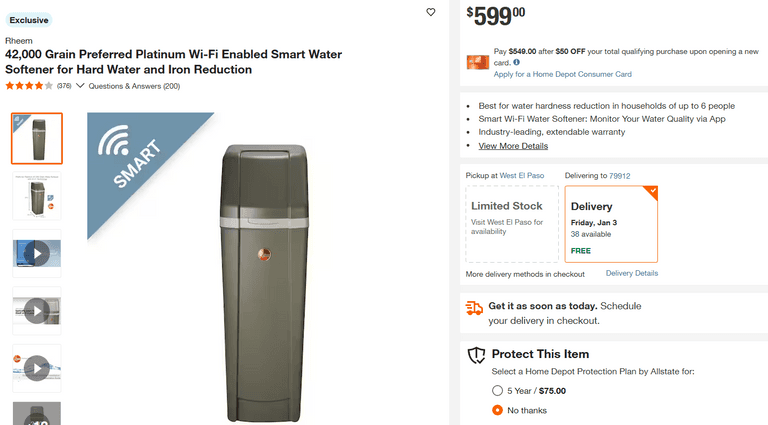 Rheem 42,000 Grain Preferred Platinum Wi-Fi Enabled Smart Water Softener for Hard Water and Iron Reduction | Open Box