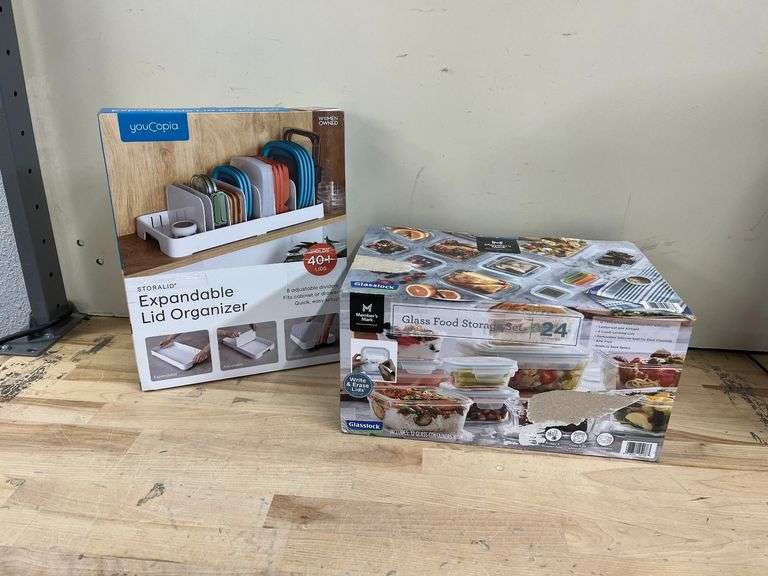 Condition Notes: Contains 1 YOUCOPIA Expandable Lid Organizer (seems in like new condition), & MERMBER'S NARK Glass Food Storage Set, missing pieces (everything included shown in images).