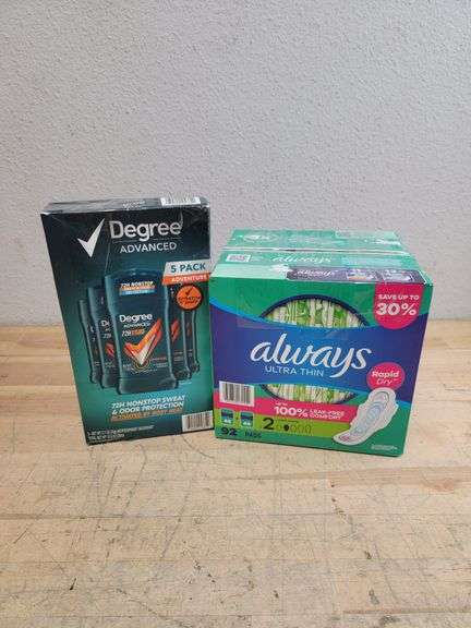 BUNDLE, Always Ultra Thin Pads, 92ct, Degree Adventure Deodorant, 4pk | Open Box | (See Condition Notes)