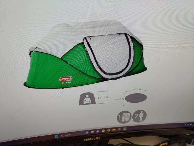 Coleman Popup 2 Person Tent Category: Outdoors & Gardens Condition Disclaimer: Please read the title and review images carefully. Unless the title specifies otherwise, auction lots HAVE NOT been tested or inspected. If an items is new or tested, it will be noted in the title. If we are aware of any damage or defect, that will be listed in the title as well. If the title does not specify a condition then the item has NOT been tested. Items are being sold as-is. We do not accept returns unless the item is significantly not as described. Sales tax and a Buyer's Premium of 13% will be added to your final invoice. Clausulas: Por favor lea los titulos y revise las imagenes cuidadosamente. A menos de que el titulo especifique otra cosa. Los lotes de las subastas NO HAN SIDO PROBADOS NI TAMPOCO INSPECCIONADOS. Si un articulo esta nuevo o esta probado, se va a especificar en el titulo. Si nosotros tenemos el conocimiento de cualquier daño o defecto, tambien sera incluido en el titulo. Si en el titulo no se especifica la condicion en la que se encuentra dicho articulo, entonces significa que el articulo NO ha sido probado. Los articulos se venden tal y como vienen. Nosotros no aceptamos devoluciones a menos de que el articulo no sea el que se describe en el titulo. Se le añadira impuestos de venta (tax) y un cargo extra de comprador Premium del 13% a cargo en su factura final.