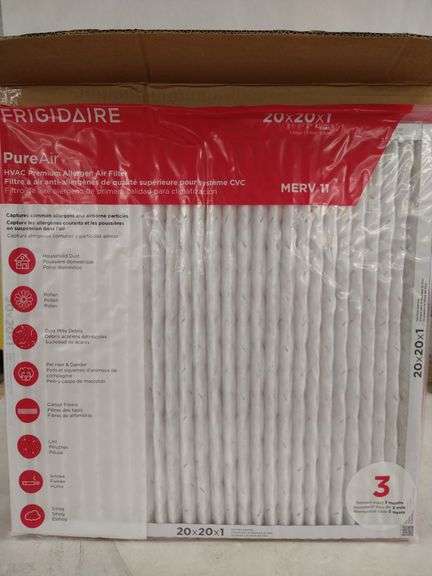 Frigidaire PureAir HVAC Premium Allergen Air Filters Category: Misc Condition Disclaimer: Please read the title and review images carefully. Unless the title specifies otherwise, auction lots HAVE NOT been tested or inspected. If an items is new or tested, it will be noted in the title. If we are aware of any damage or defect, that will be listed in the title as well. If the title does not specify a condition then the item has NOT been tested. Items are being sold as-is. We do not accept returns unless the item is significantly not as described. Sales tax and a Buyer's Premium of 13% will be added to your final invoice. Clausulas: Por favor lea los titulos y revise las imagenes cuidadosamente. A menos de que el titulo especifique otra cosa. Los lotes de las subastas NO HAN SIDO PROBADOS NI TAMPOCO INSPECCIONADOS. Si un articulo esta nuevo o esta probado, se va a especificar en el titulo. Si nosotros tenemos el conocimiento de cualquier daño o defecto, tambien sera incluido en el titulo. Si en el titulo no se especifica la condicion en la que se encuentra dicho articulo, entonces significa que el articulo NO ha sido probado. Los articulos se venden tal y como vienen. Nosotros no aceptamos devoluciones a menos de que el articulo no sea el que se describe en el titulo. Se le añadira impuestos de venta (tax) y un cargo extra de comprador Premium del 13% a cargo en su factura final.